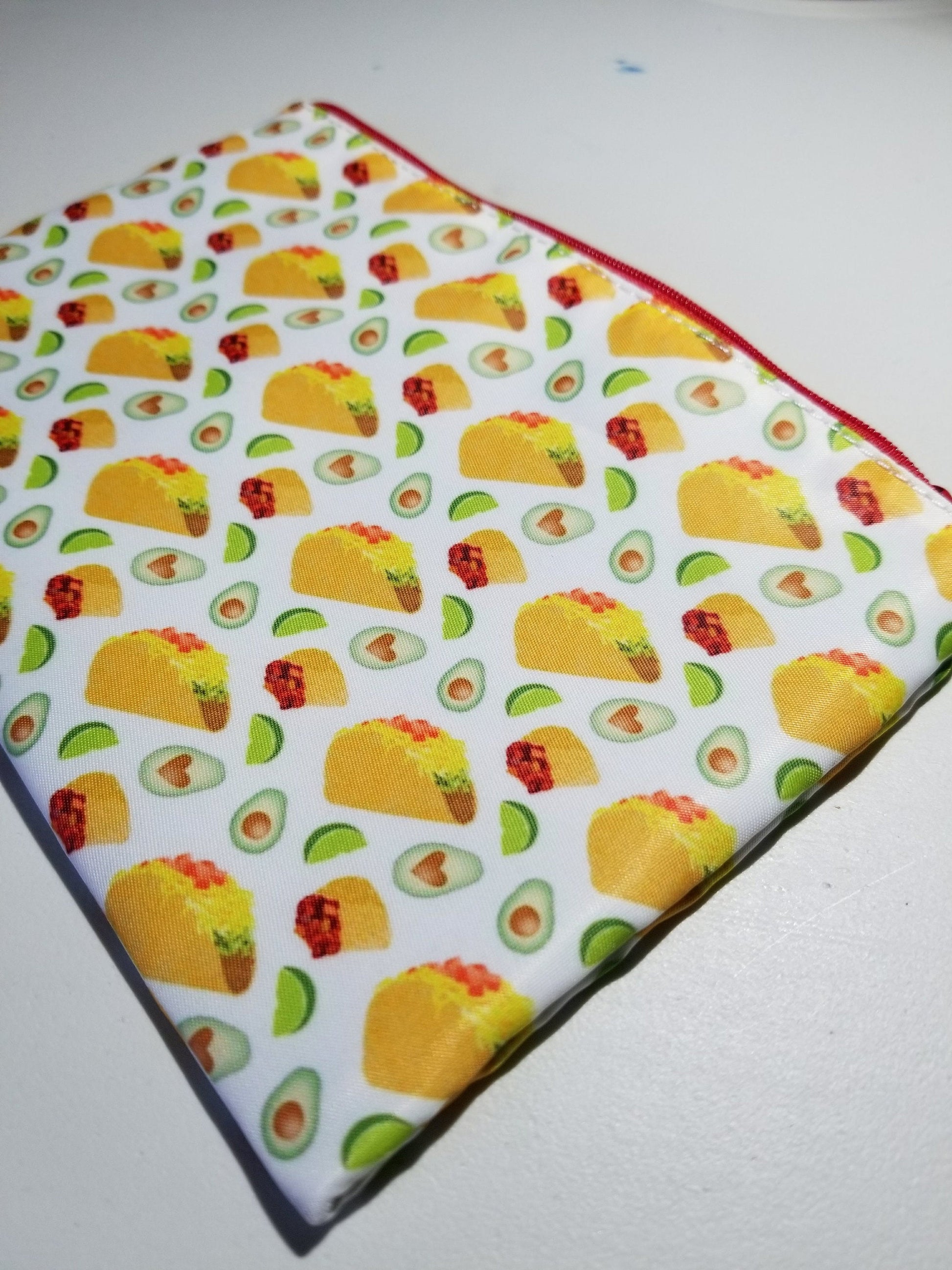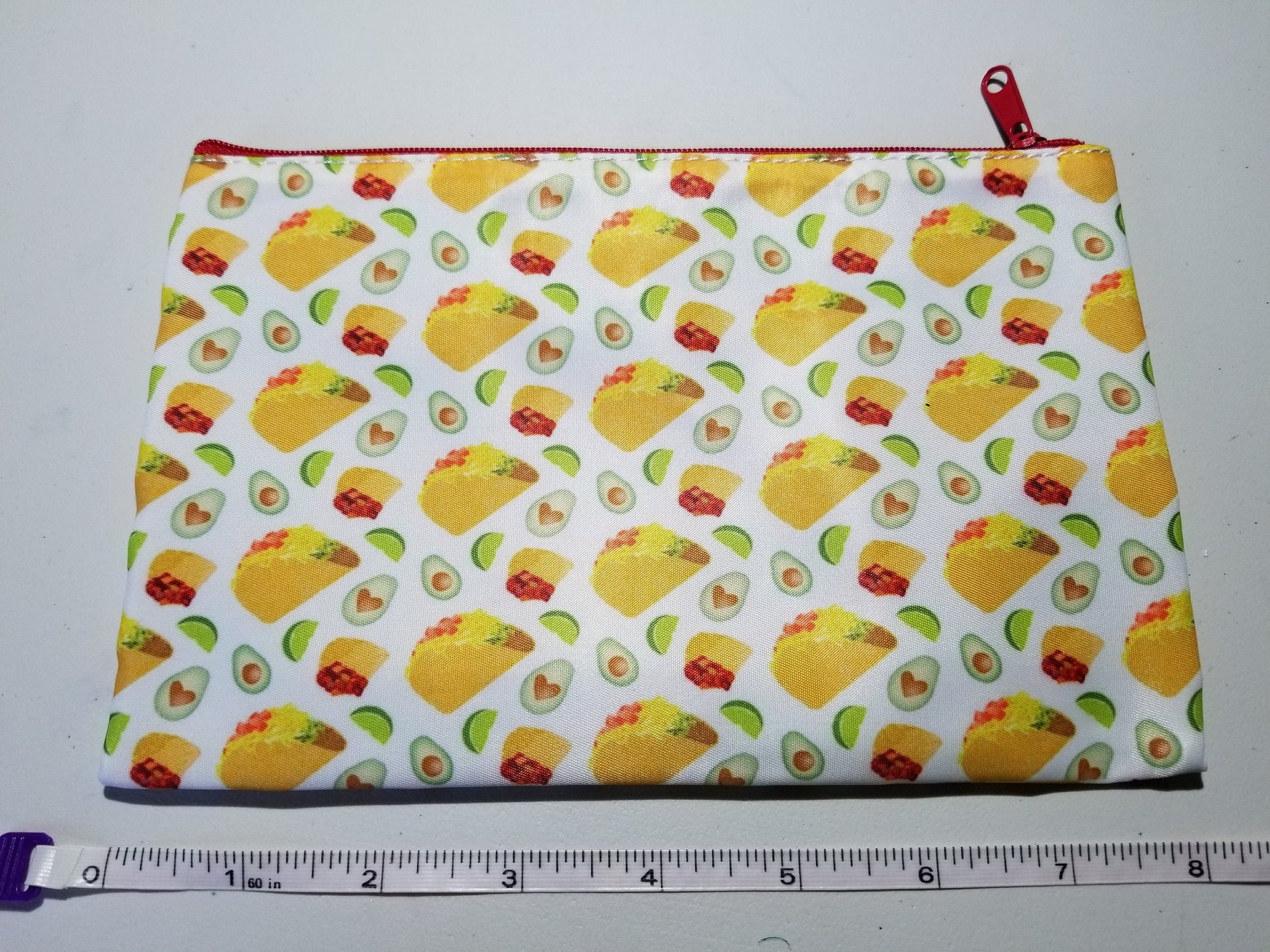This mid-sized 8"x5" pouch is perfect for all sorts of purposes. It's the perfect size to use as a pencil case, wallet, and even a tampon case. The pouch is made of 100% polyester material, making it durable and water resistant. The interior has an extra black lining inside, as well as a smaller interior zipper pouch.